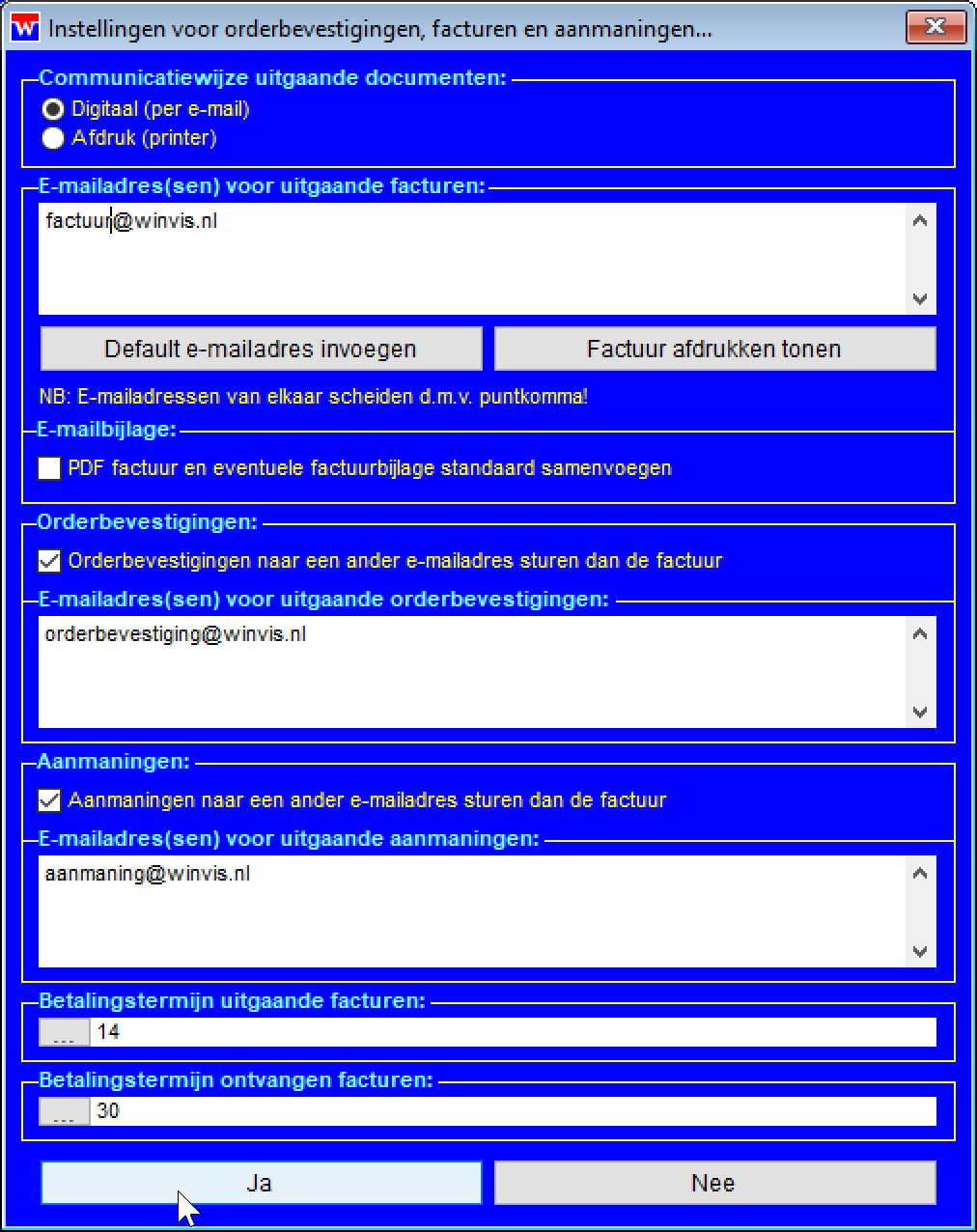 NB: Bij gebruik van Gmail voor uitgaande e-mail zult u voor ieder gebruiksdoel dan een eigen account moeten maken, bijvoorbeeld winvissales@gmail.com en winvisinvoices@gmail.com. Enkel het vaste e-mailadres dat bij het account hoort werkt nl. niet bij gebruik van Gmail.