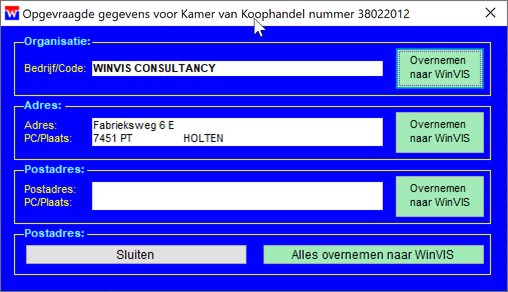 WinVIS haalt deze gegevens op en u kunt deze informatie desgewenst direct overnemen in WinVIS relatiebeheer. U kunt afzonderlijke informatie overnemen of in één keer alles overnemen naar WinVIS.