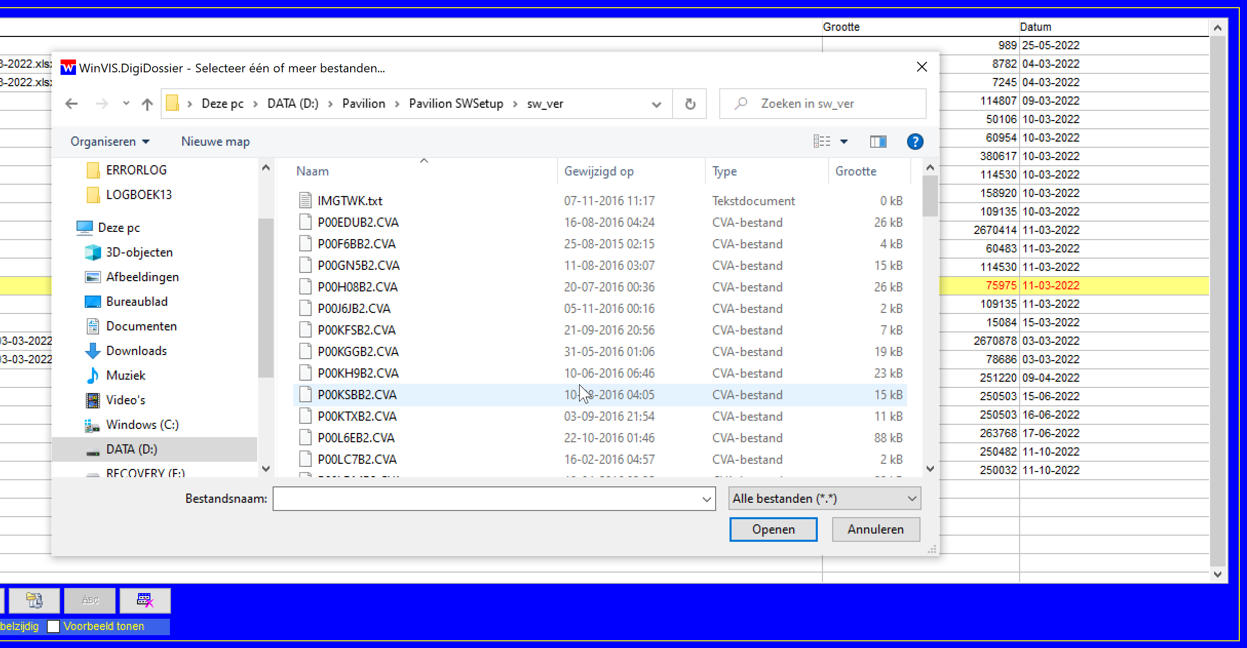 WinVIS DigiDossier update (november 2022) De modules DigiDossier voor het scannen, samenvoegen, digitaliseren en archiveren van documenten en bestanden is flink gewijzigd. Zo maken we nu gebruik van een andere techniek voor het in- en uitpakken van archiefbestanden. Deze is sneller en betrouwbaarder bij archieven met een grote omvang. Voor gebruikers met Windows 10 (en later) hebben we het selectiescherm voor het invoegen van bestanden gewijzigd, waardoor het scherm optimaal aansluit bij de gebruikte Windows versie.