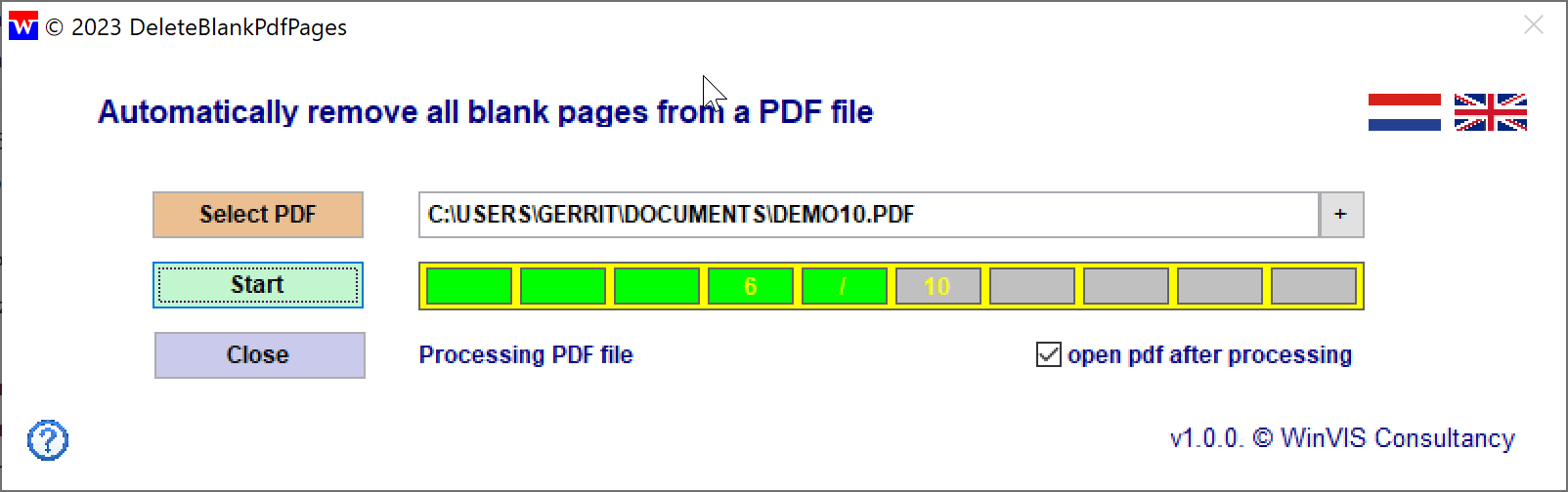 The program is bilingual, you can select the language with the flags at the top right. The language setting is saved by the program. The same applies to whether or not you want to open the PDF after processing.