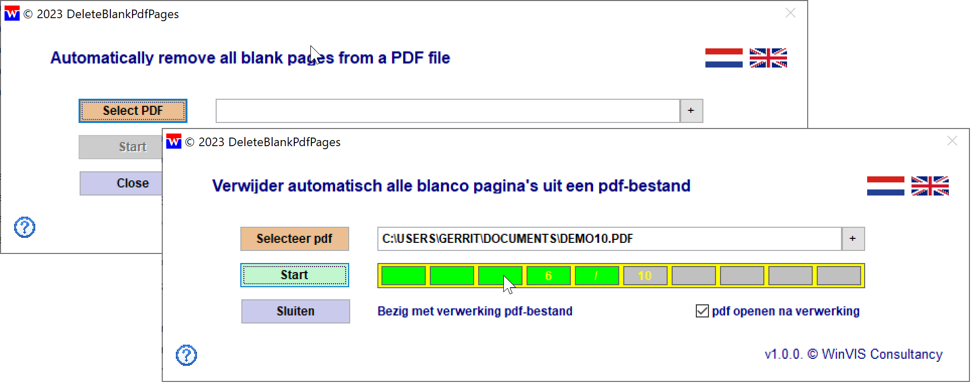 WinVIS DeleteBlankPdfPages WinVIS is goed in het samenvoegen van pdf-documenten. We gebruiken het bijvoorbeeld uitgebreid in de module calculatie voor het maken en e-mailen van offertes, incl. bijlagen. In deze module zit dan ook een optie die je aan kunt vinken om automatisch onbedoelde blanco pagina's uit het pdf-document te verwijderen. Deze functie hebben we ook in een zelfstandig programma ondergebracht. Dit programma is tevens tweetalig gemaakt (Nederlands en Engels).