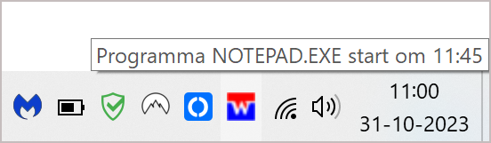 Zoals je kunt zien, is er een programma gepland om om 11:45 uur te draaien, genaamd NOTEPAD.EXE. Deze melding wordt zichtbaar als je met de muis over het taakplannerpictogram in het systeemvak beweegt.