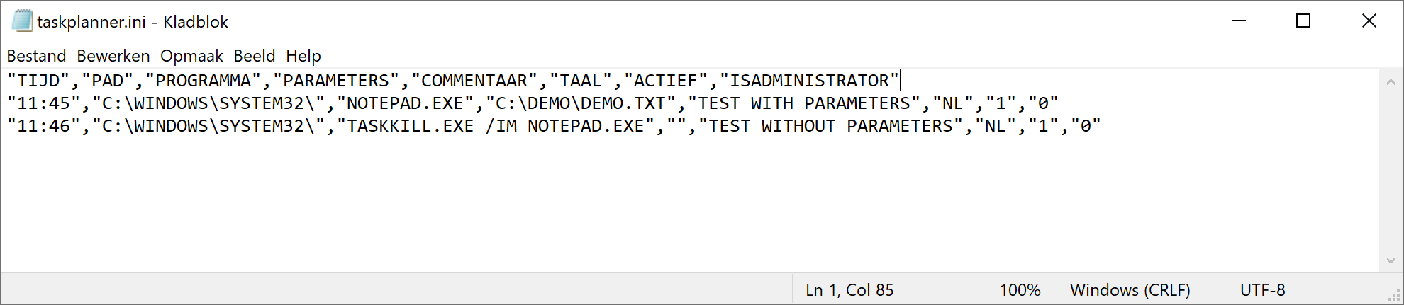 Sla dit bestand op in de map C:\ProgramData\TaskPlanner en roep dit bestand als volgt aan via task-planner.ini: